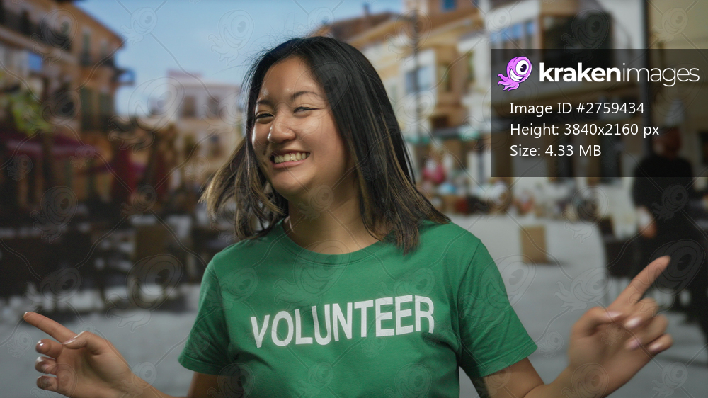 Young woman in green volunteer shirt smiling joyfully outdoors on a busy city street, embracing community spirit and engagement.