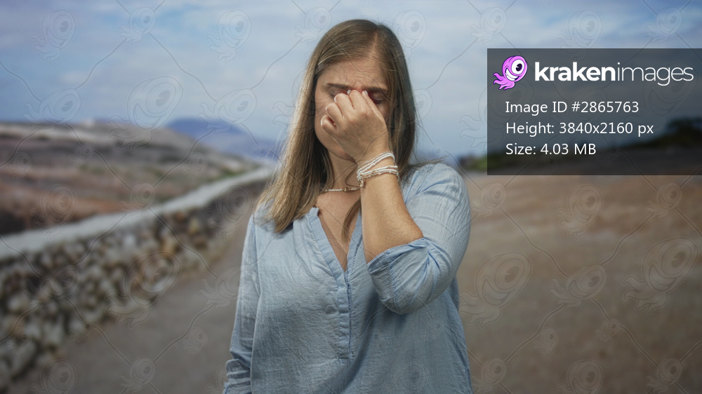 Young woman in light blue blouse pinches nose on street beside rocky embankment under sunlit sky; disgust.