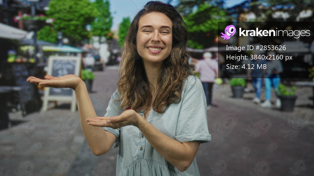 Young woman in light blue dress smiles while holding both open palms on a busy street; optimism hope success ambition.