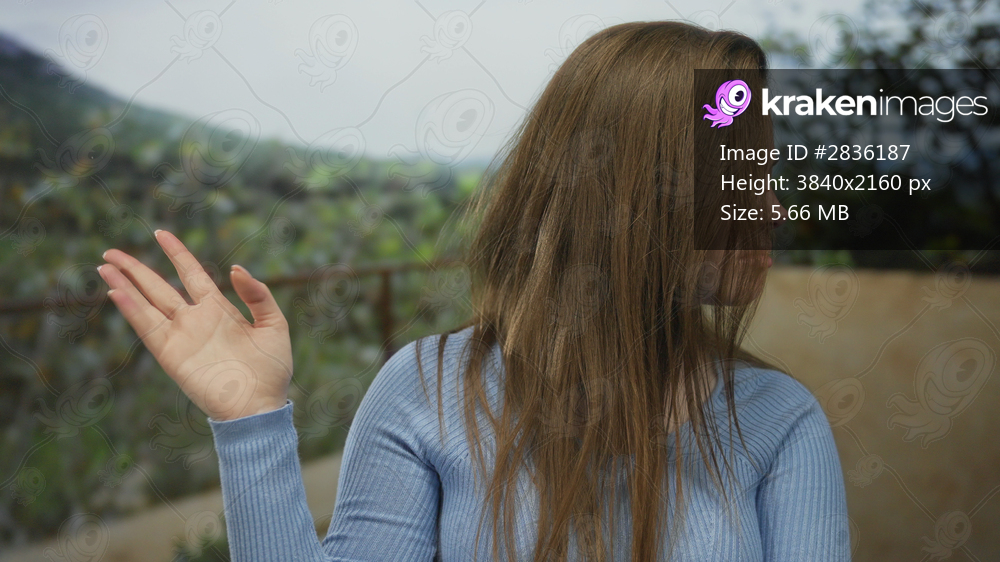 Young woman in light blue sweater raises hand and turns face away near building; social refusal reaction.