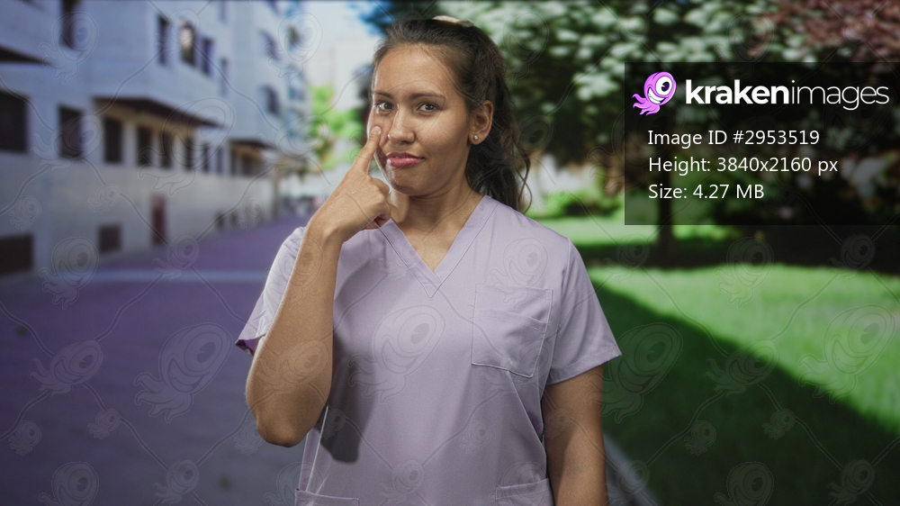 Young woman in lilac scrubs points finger to cheek on an urban street with building facades nearby; curious pondering.