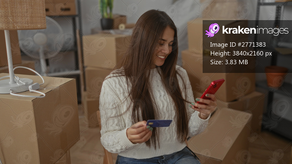 Young woman in living room holding credit card and smartphone surrounded by boxes in new home setting, smiling happily during online shopping.
