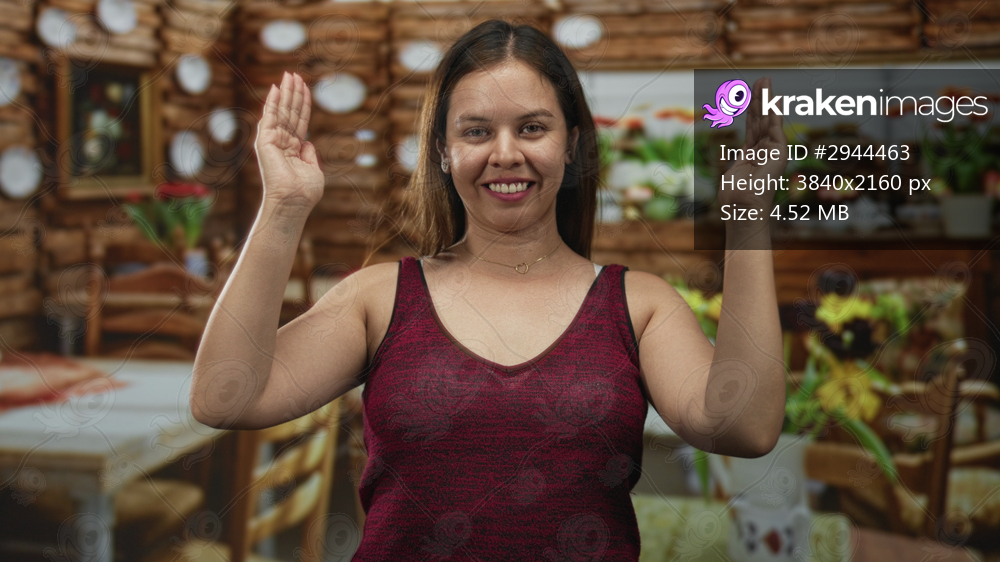 Young woman in maroon tank top raising both bare arms palms forward in a restaurant dining room; joy celebration.