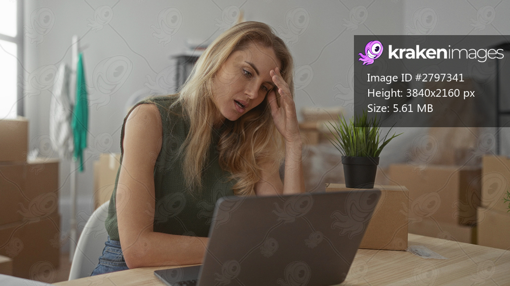 Young woman in new apartment sitting stressed at desk with laptop surrounded by moving boxes, reflecting the challenges of relocation and settling into a new home. - Kraken Images