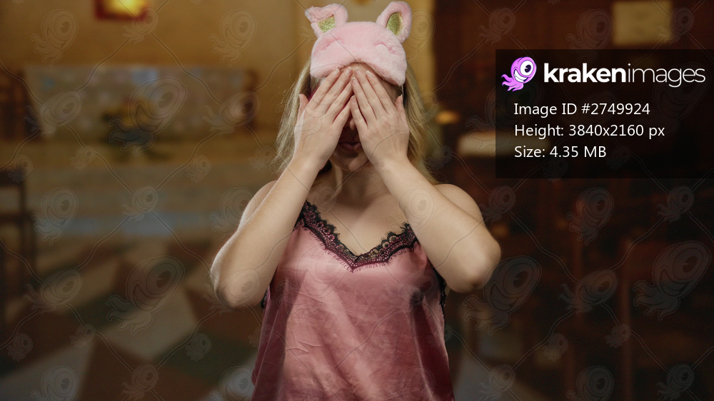 Young woman in nightwear playfully covering face with hands in a catholic church setting, capturing a mix of innocence and curiosity in a serene, spiritual environment. - Kraken Images