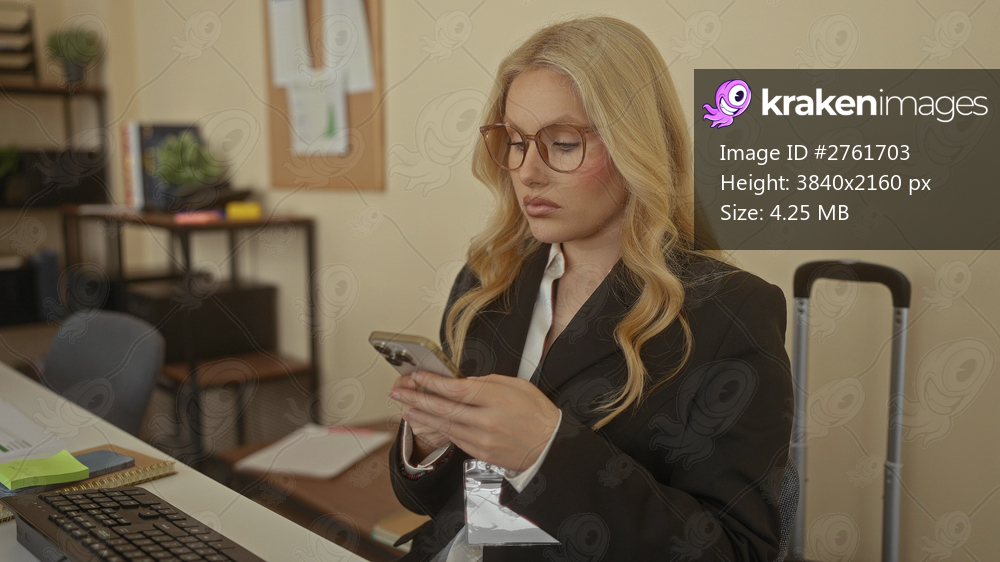 Young woman in office uses smartphone surrounded by office decor suggesting a professional indoor environment with a laptop, documents, and plants visible around her. - Kraken Images