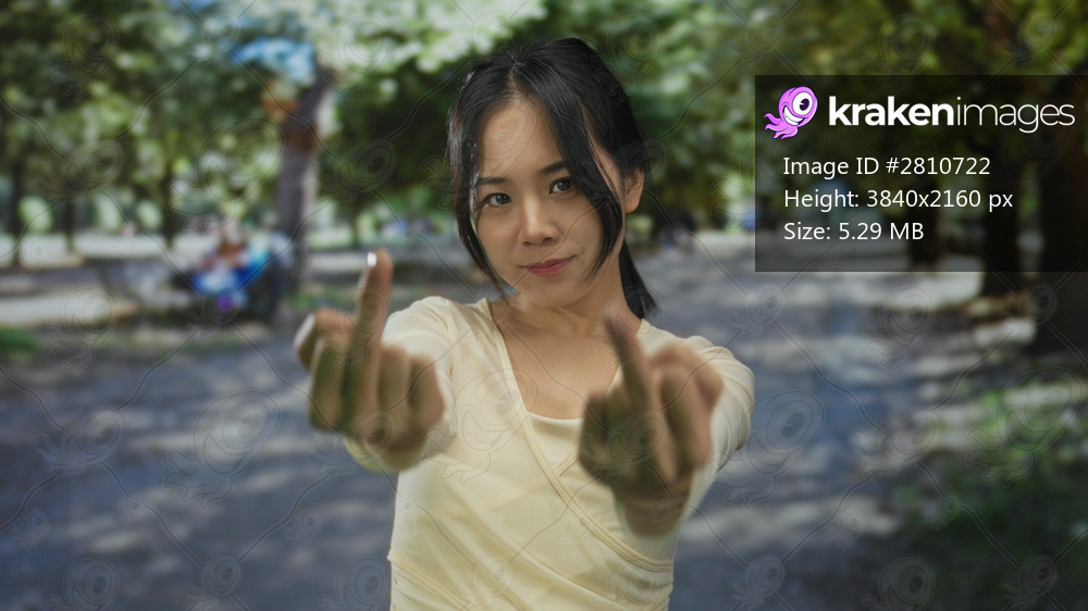 Young woman in park making hand gesture outdoors with trees and blurred background exuding calm yet rebellious vibe in natural setting with expressive facial expression. - Kraken Images