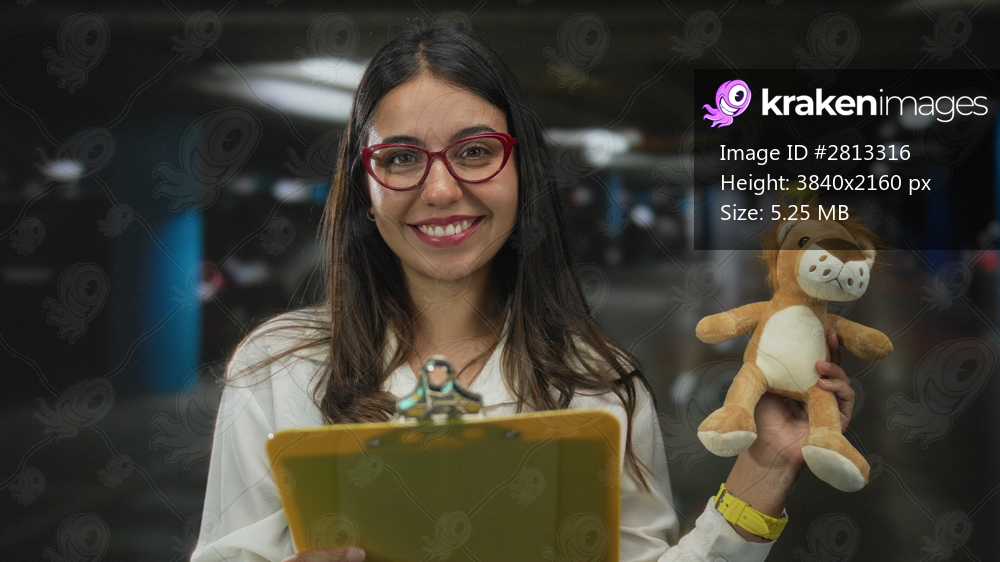 Young woman in parking garage holding clipboard and plush toy, smiling confidently, showcasing professional atmosphere in indoor setting.