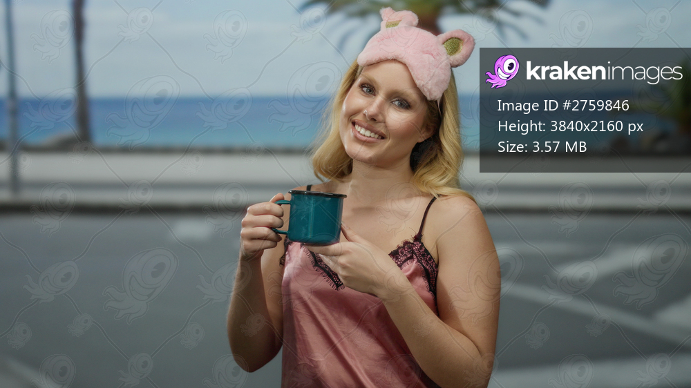 Young woman in pink nightwear holding a blue mug outdoors on a city street with ocean view and palm trees in the background