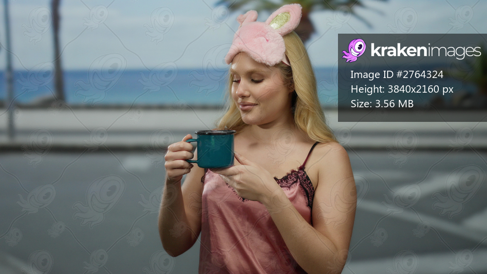 Young woman in pink nightwear holding a blue mug outdoors on a city street with ocean view and palm trees in the background