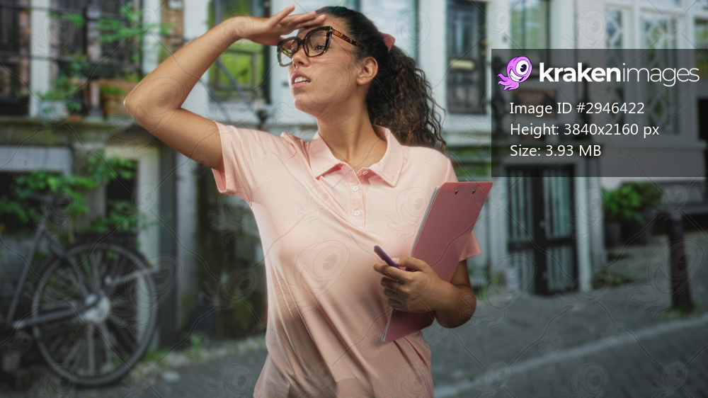 Young woman in pink polo holding clipboard and pen, hand shielding eyes while smiling on street; curious.