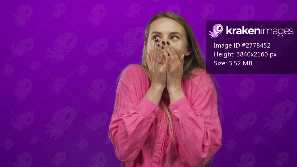 Young woman in pink shirt covering her mouth with surprise against isolated purple background is captured in a candid expression of shock and emotion.