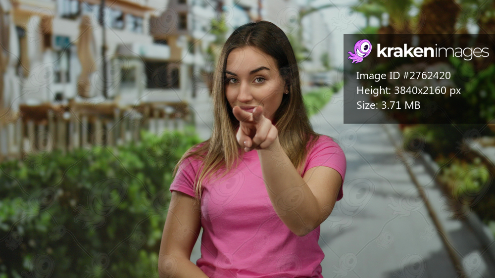 Young woman in pink shirt gestures on a sunny street, showcasing a vigilant expression amidst a vibrant urban outdoor setting.