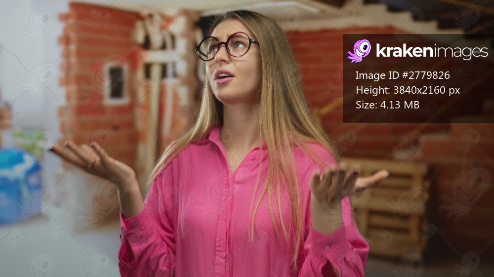 Young woman in pink shirt indoors at construction site appears puzzled with hands raised, surrounded by red brick walls and building materials.
