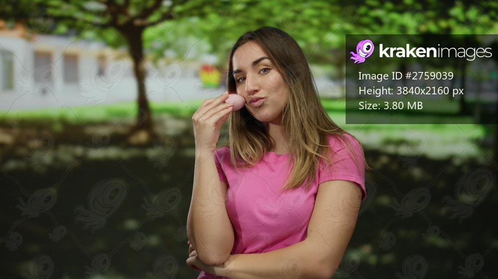 Young woman in pink shirt playfully holding beauty sponge in sunny park with trees and greenery, capturing a joyful outdoor moment.