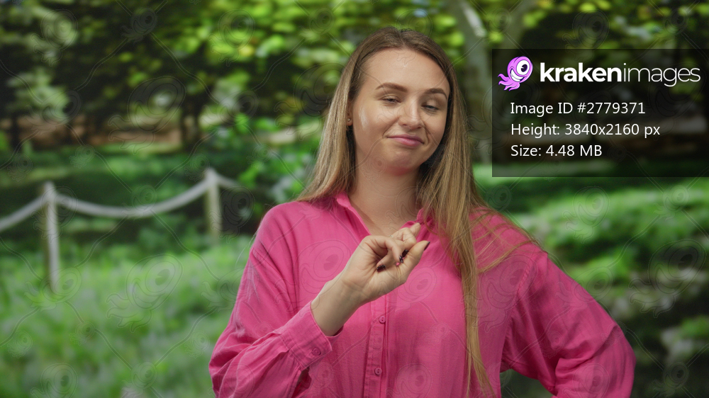 Young woman in pink shirt standing in a green park, gesturing with a smile, under bright natural light, showing expressive body language amidst lush outdoor scenery. - Kraken Images