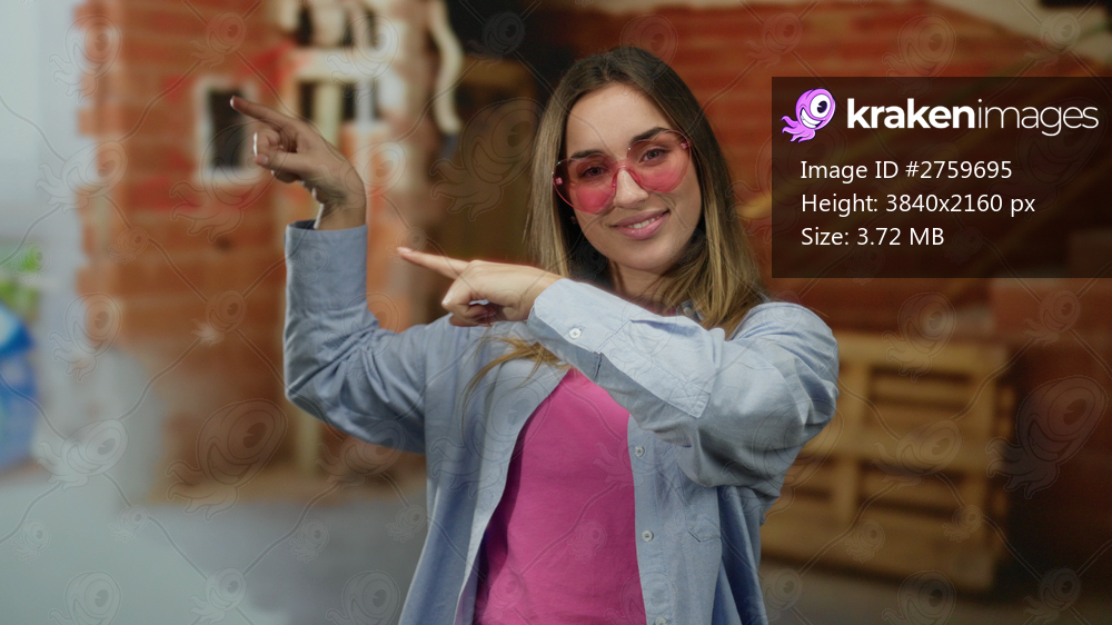 Young woman in pink sunglasses gestures confidently at an indoor construction site with exposed brick walls and wooden pallets.