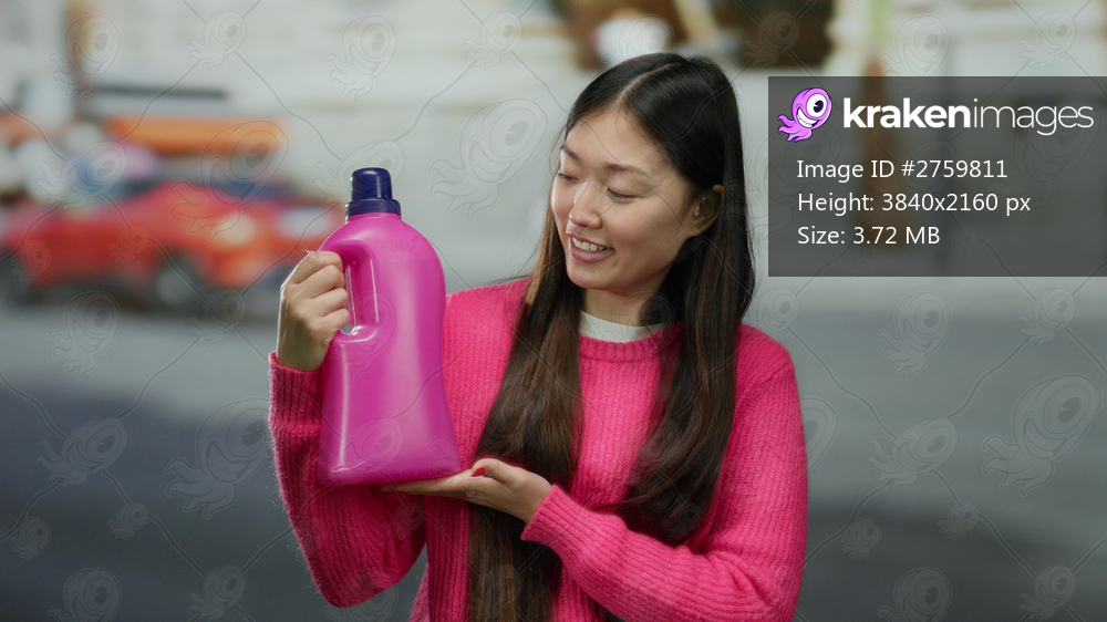 Young woman in pink sweater holding detergent bottle on urban street, smiling and looking at product, with city background in focus, displaying consumerism theme outdoors. - Kraken Images