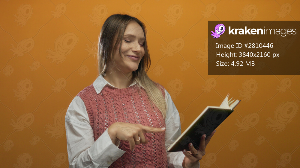Young woman in pink sweater holds book gesturing confidently against vibrant orange background indicating reading focus