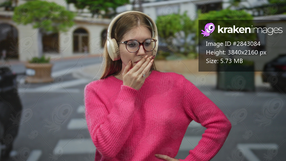 Young woman in pink sweater wearing glasses adjusts headphones on city street; surprise curiosity reflection.