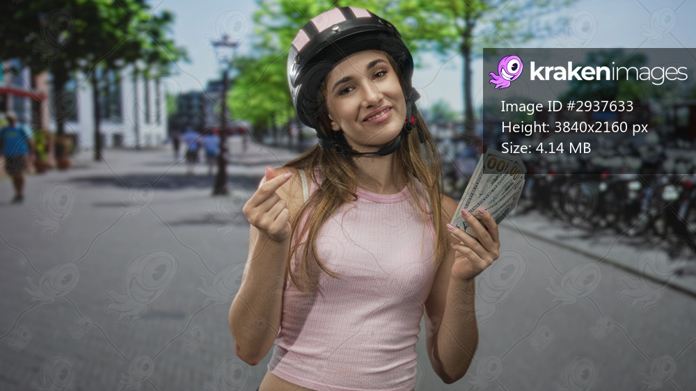 Young woman in pink tank top holding fanned cash and making a finger gesture on a busy city street while wearing a bike helmet; confidence wealth independence. - Kraken Images