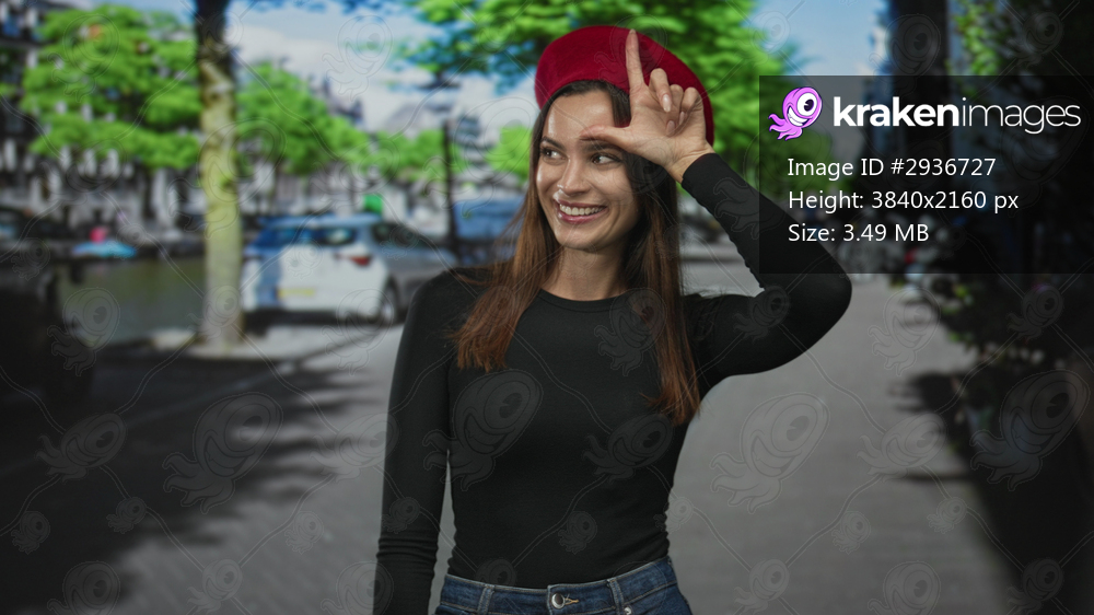 Young woman in red beret makes l sign with hand on forehead on amsterdam street, smiling; playful joy.