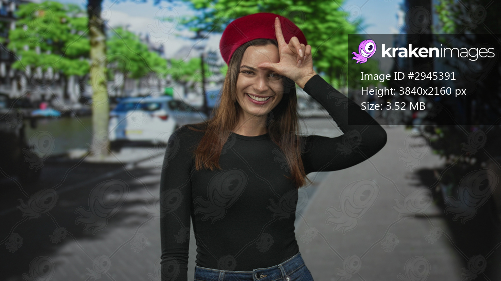Young woman in red beret makes l sign with hand on forehead on amsterdam street, smiling; playful joy.