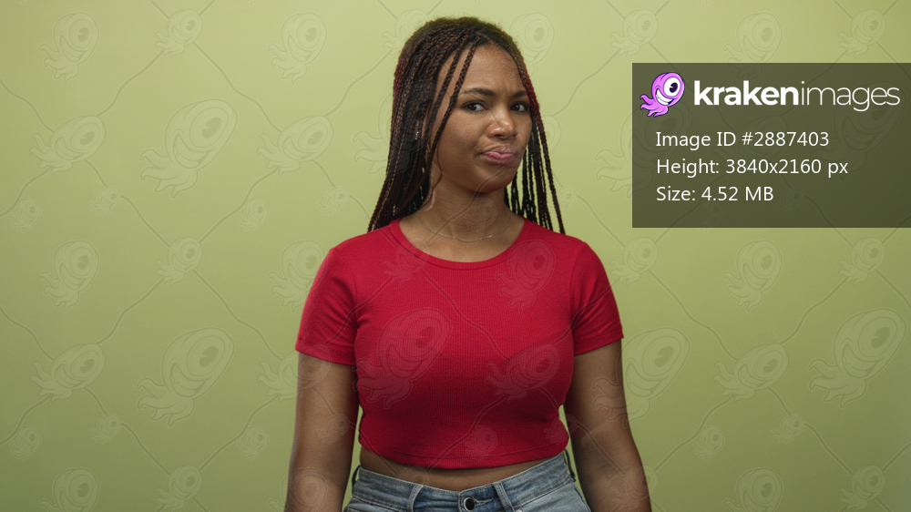 Young woman in red crop top purses lips in studio against a pale olive green backdrop, frontal pose with jeans visible; skepticism.