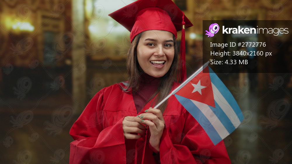 Young woman in red graduation attire holds a cuban flag inside a museum, expressing joy and achievement in an elegant setting.