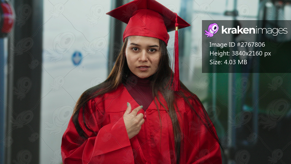 Young woman in red graduation gown gesturing no with a finger while standing inside a bus, emphasizing a firm refusal message in a unique public transport setting. - Kraken Images