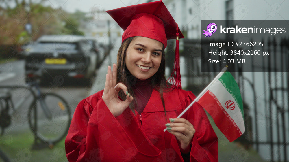 Young woman in red graduation gown holds iranian flag making okay gesture on street, symbolizing achievement and pride.