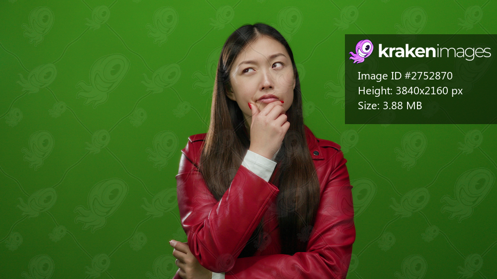 Young woman in red jacket pondering against green background, exuding elegance and confidence, while maintaining a thoughtful expression with hand on chin. - Kraken Images