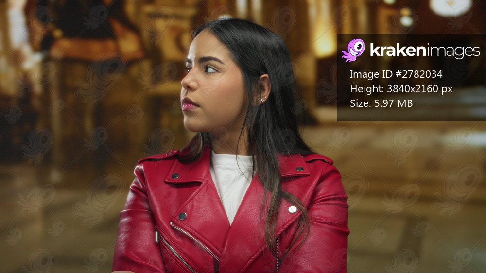 Young woman in red jacket stands indoors, bright church setting in background, reflecting thoughtful expression framed by warm lighting.
