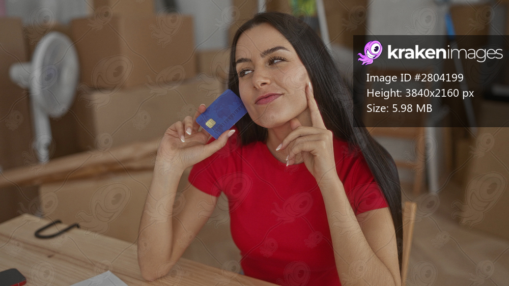 Young woman in red shirt holding credit card in living room filled with moving boxes, symbolizing new home and financial planning.