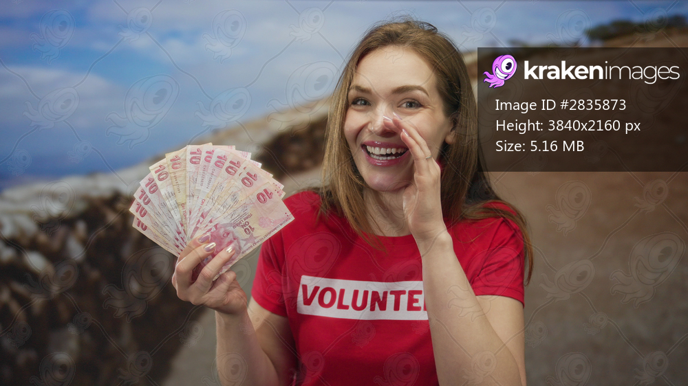 Young woman in red shirt holds turkish lira banknotes and cups hand to mouth at street; charity appeal excitement.