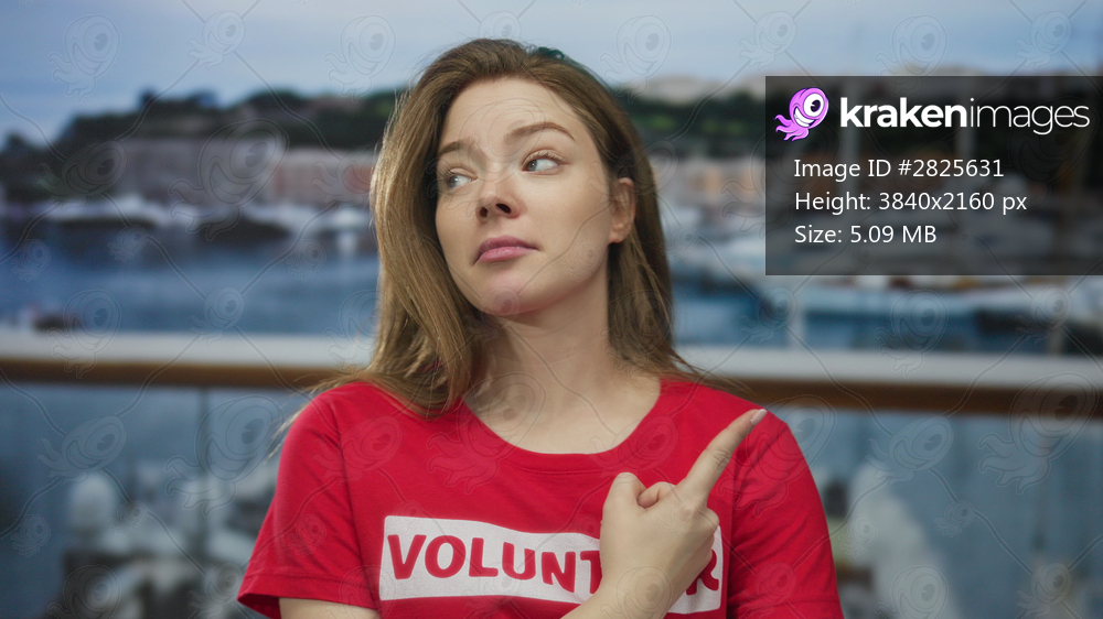 Young woman in red shirt points finger at sailboats beside harbor building railing; community service doubt.