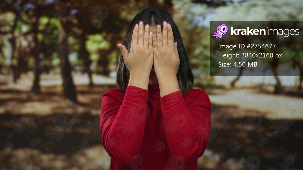 Young woman in red sweater reveals her smiling face in a sunny park, surrounded by vibrant trees and natural beauty, capturing a moment of joyful surprise outdoors. - Kraken Images