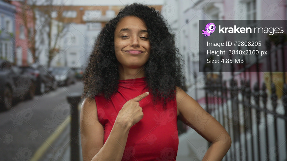 Young woman in red top and curly hair points finger to herself on a street lined with iron fence and parked cars; self confidence.