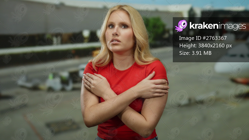 Young woman in red top feeling cold at airport terminal with airplanes in the background.