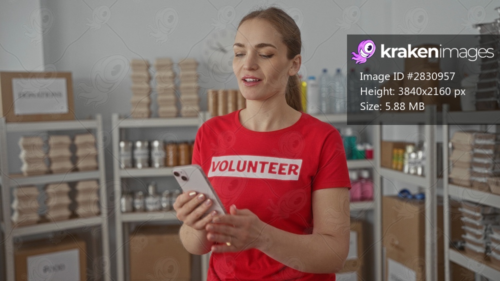 Young woman in red tshirt holds smartphone at arm’s length for a selfie in a donation center building; charity compassion.