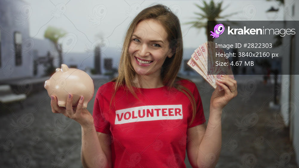 Young woman in red volunteer shirt fans turkish lira banknotes and holds piggybank on street; fundraising generosity.
