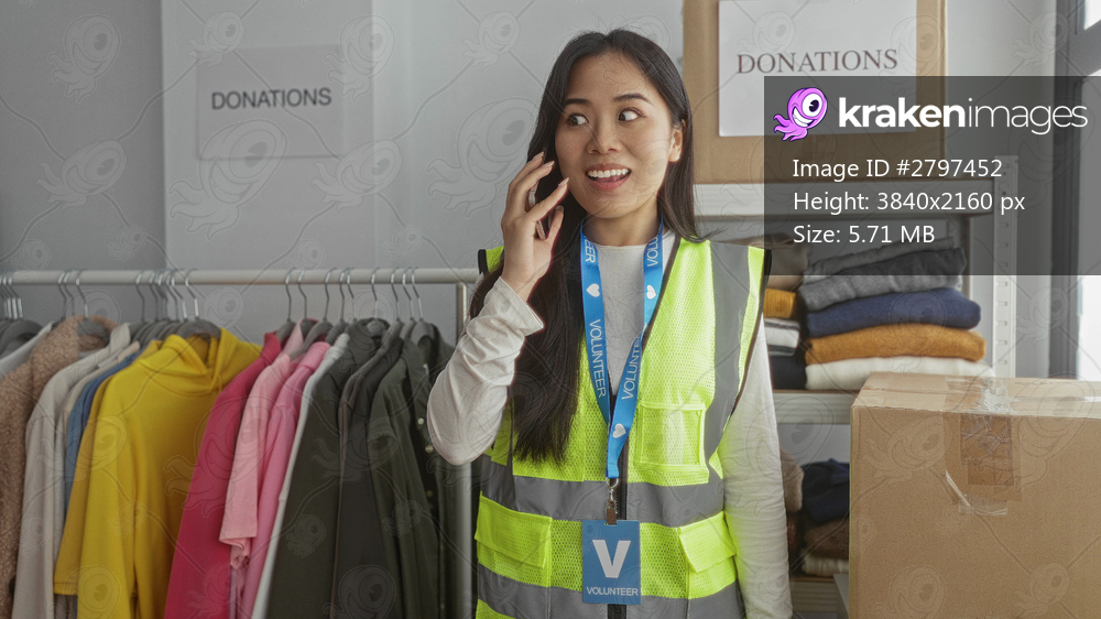 Young woman in reflective vest talks on phone in an indoor charity center, surrounded by donations of clothes and boxes, signifying volunteer work.
