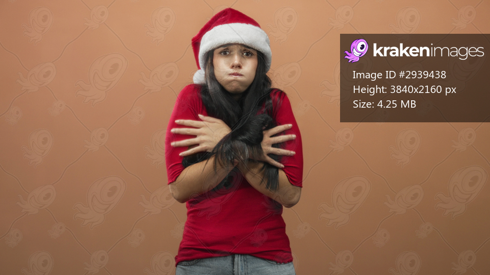 Young woman in santa hat crosses hands over chest with puffed cheeks and shivering pose in studio; discomfort.