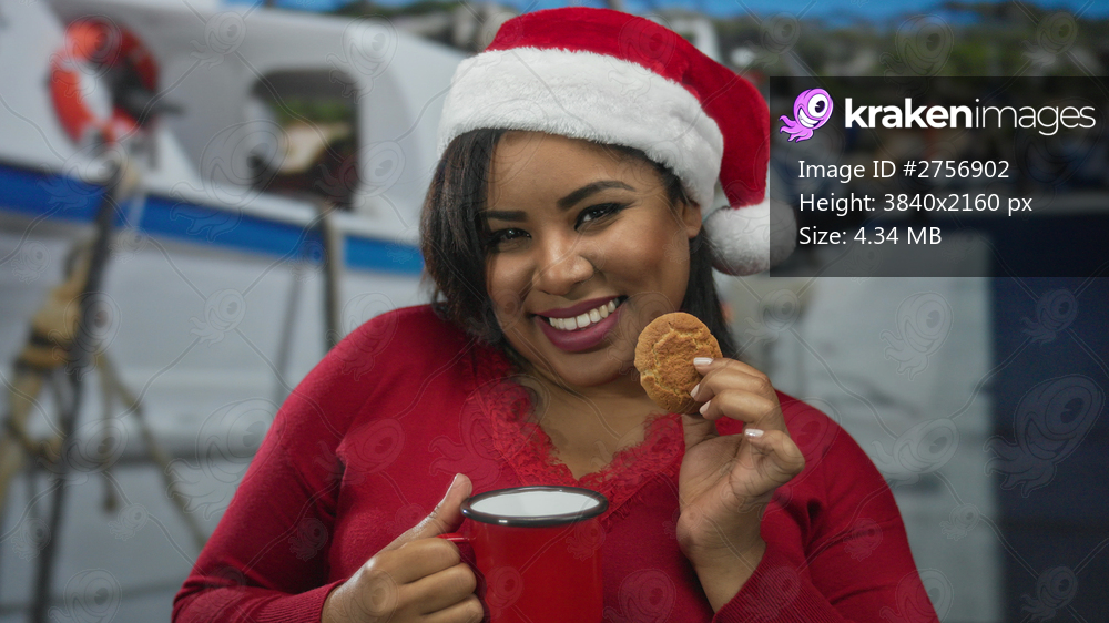 Young woman in santa hat enjoys coffee and cookie by the seaside boat.