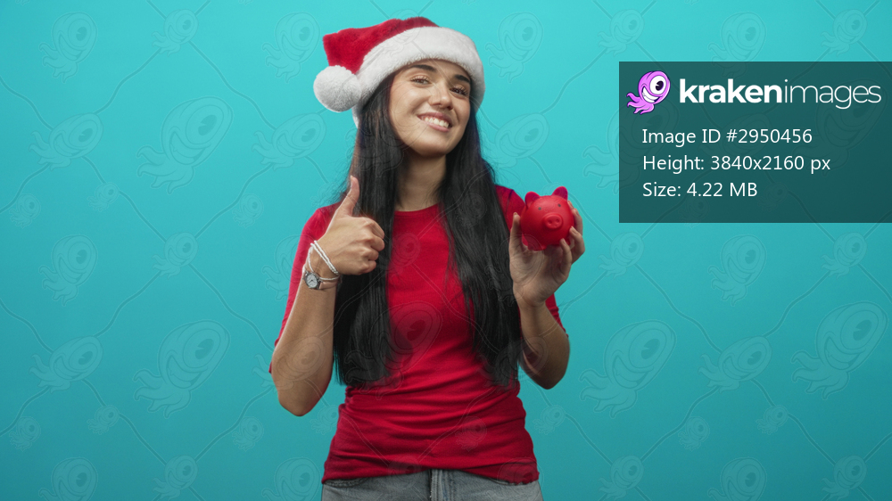 Young woman in santa hat holding a red piggy bank and showing thumbs up while smiling in studio with teal backdrop; cheerful saving.