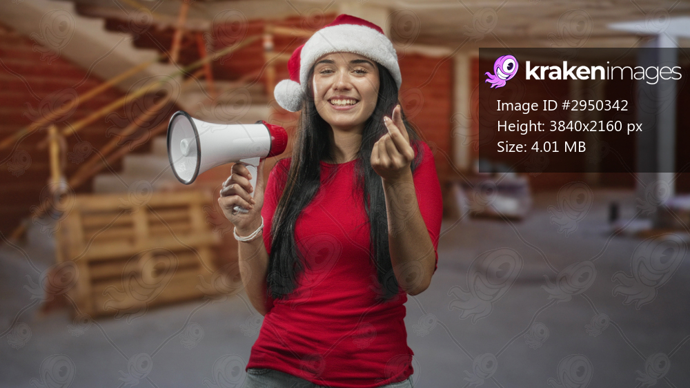 Young woman in santa hat holding megaphone and making money finger gesture in an unfinished building; cheerful holiday mood.