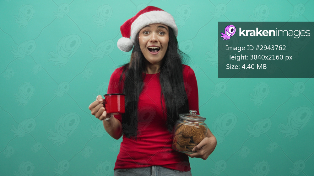 Young woman in santa hat holding red mug and glass cookie jar, smiling with eyes closed and raising hand in studio; holiday joy.