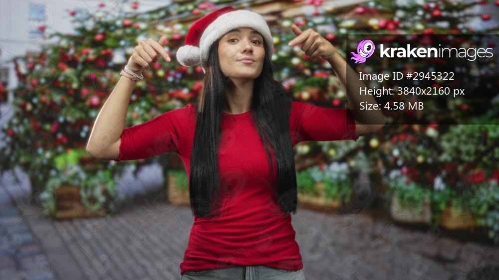 Young woman in santa hat points fingers down on cobblestone street by decorated christmas tree and lights; holiday joyful cheer.