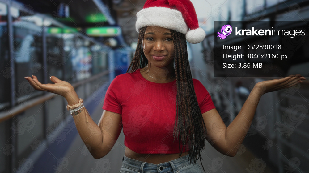 Young woman in santa hat and red shirt shrugs both hands in building corridor aboard cruise ship deck; holiday uncertainty.