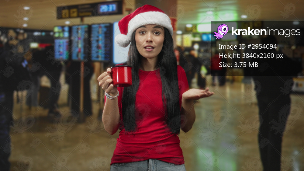 Young woman in santa hat smiling softly holds a red mug with one hand and places the other hand on her chest at airport; holiday warmth giving.